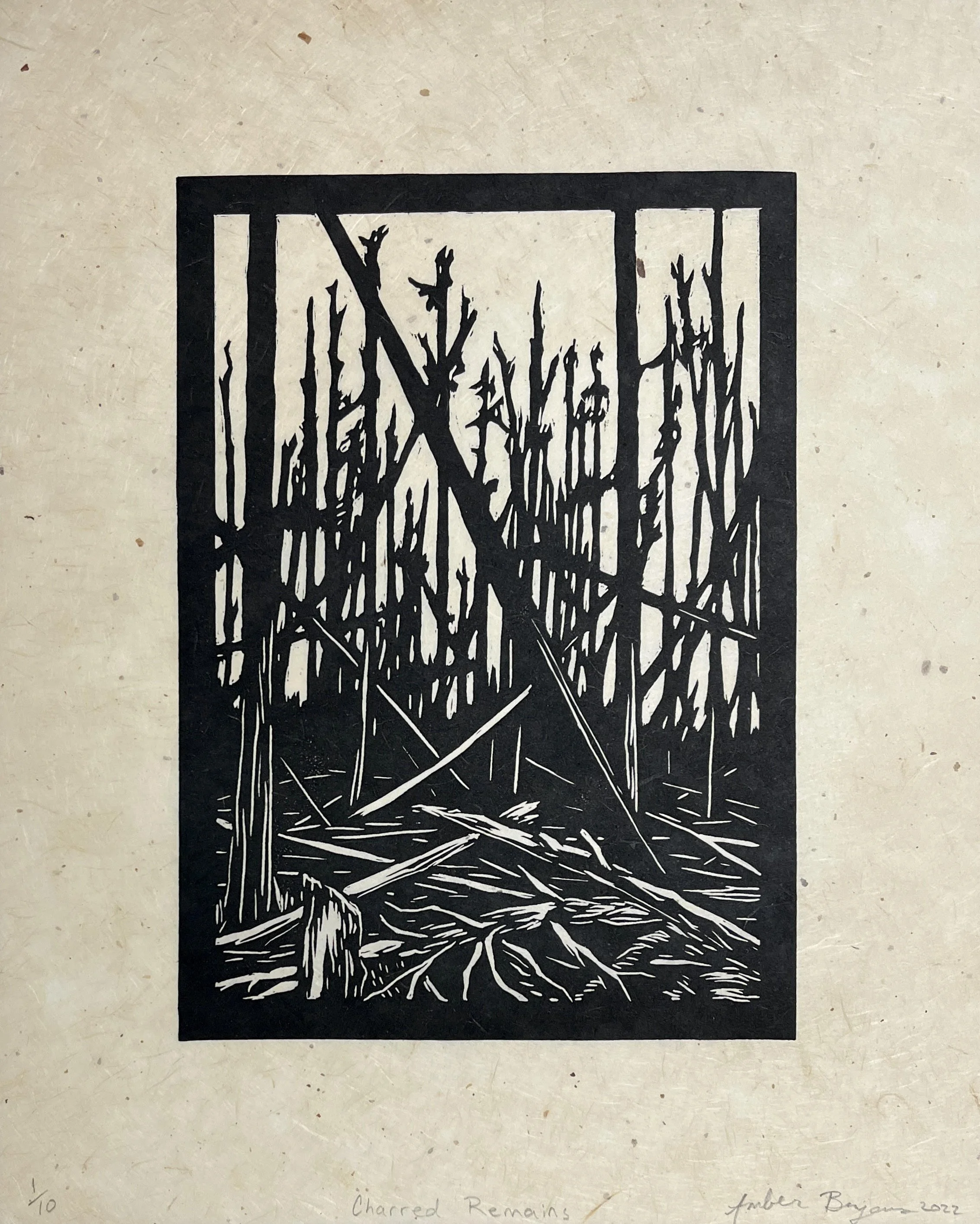 “Charred Remains” by Amber Bryans Linocut | Speedball Professional Relief Ink on Gampi Smooth Paper 2022